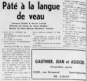 C’est justement en participant au concours Recettes de Tartes du Vieux-Québec financé par la marque de farine Brodie & Harvie Limited qu’à l’âge de 43 ans, Mme Bouchard développe un intérêt particulier pour l’art culinaire (Progrès-Dimanche, 11 avril 1965 : 14). Les goûts, ça ne se discute pas, mais j’estime que soumettre une recette de pâté à la langue de veau était une idée particulièrement audacieuse.